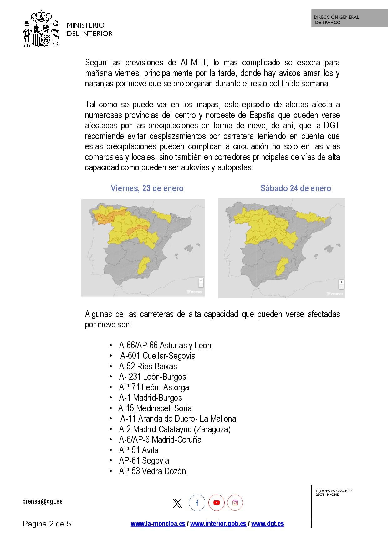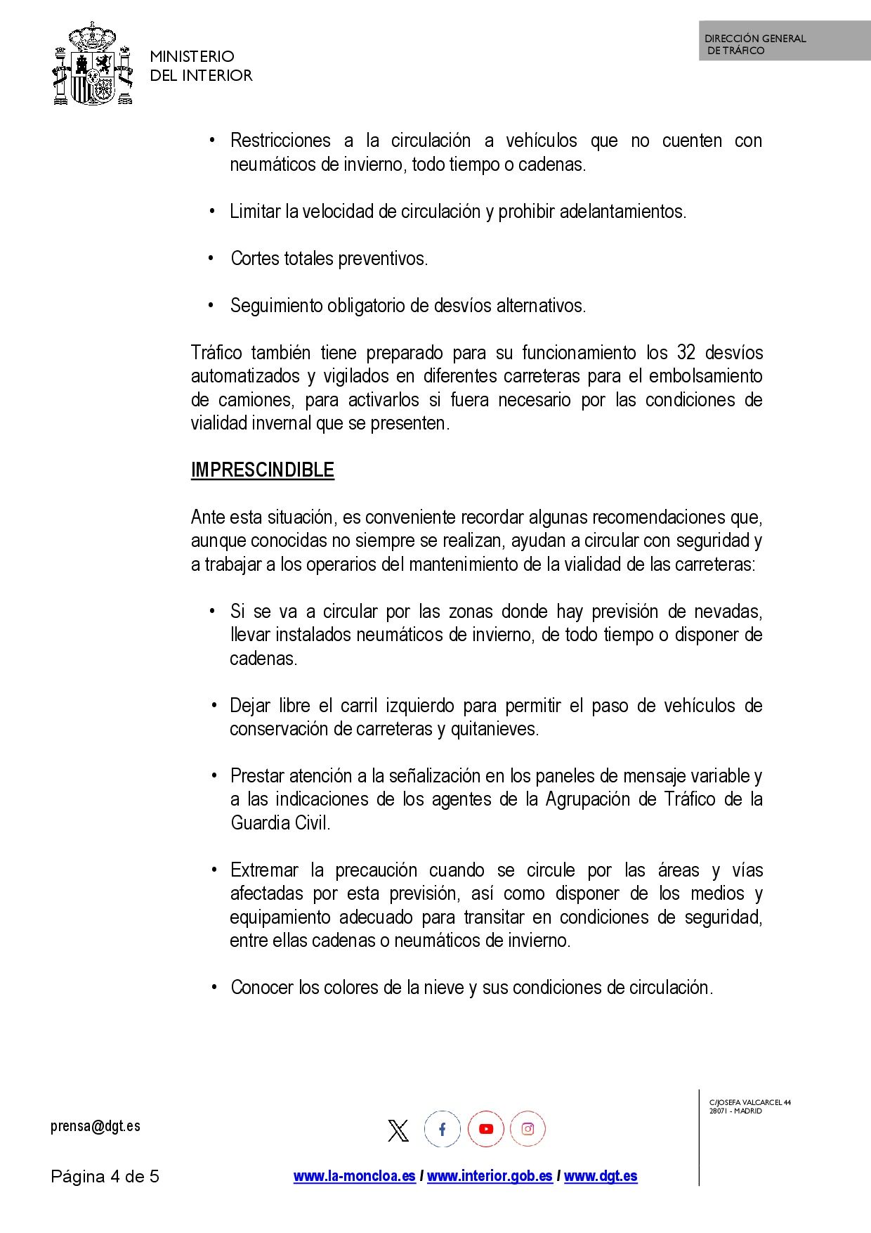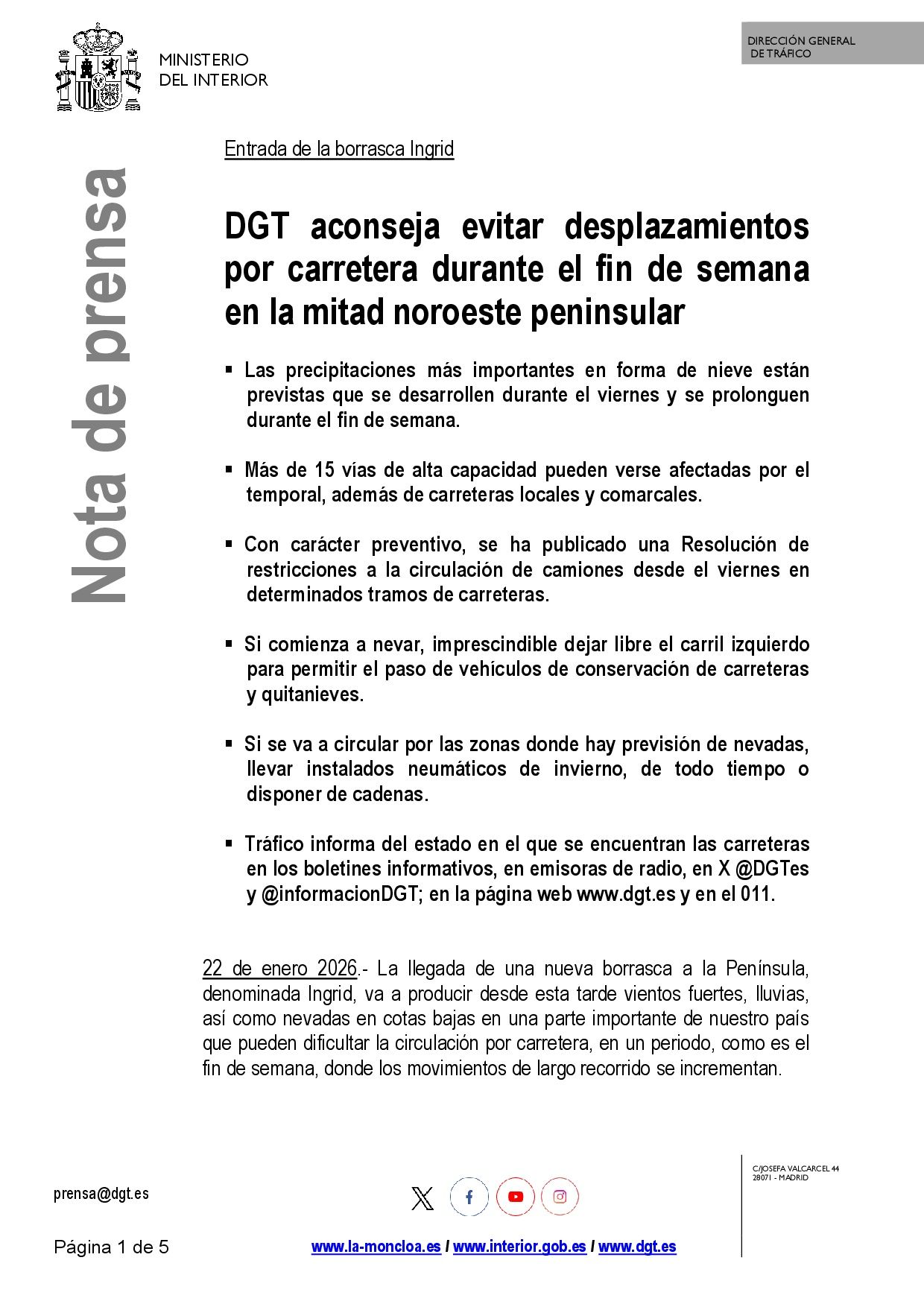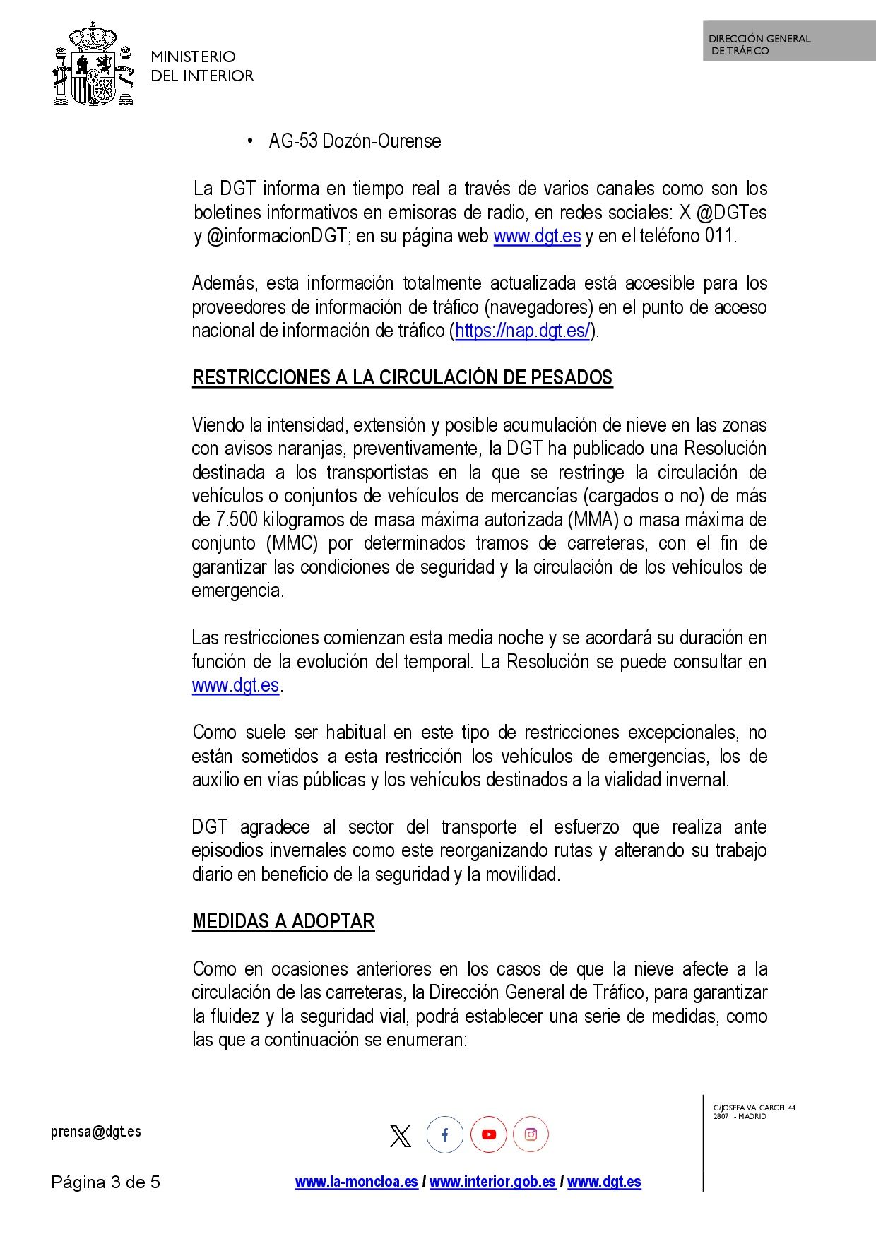 Se adjunta resolución sobre la restricción de vehículos pesados por nevadas como consecuencia de la borrasca Ingrid así como nota de prensa al respecto emitida por la Dirección General de Tráfico.