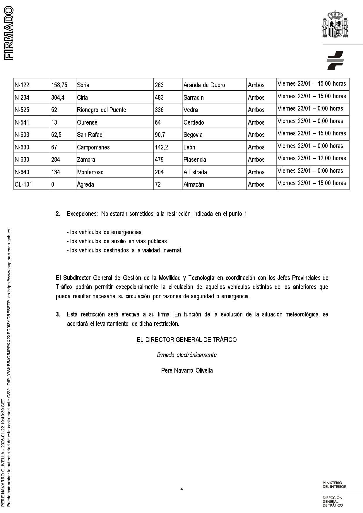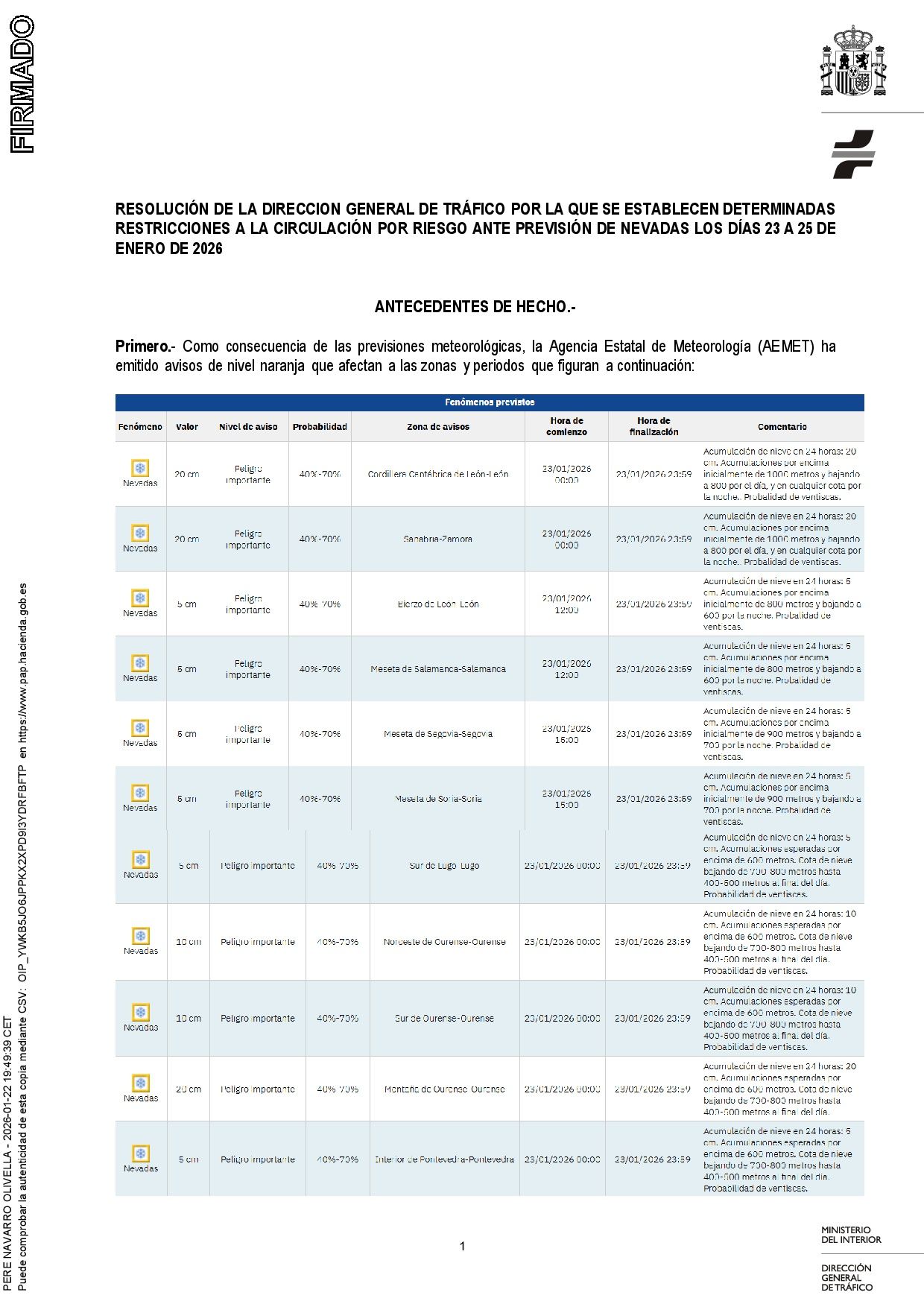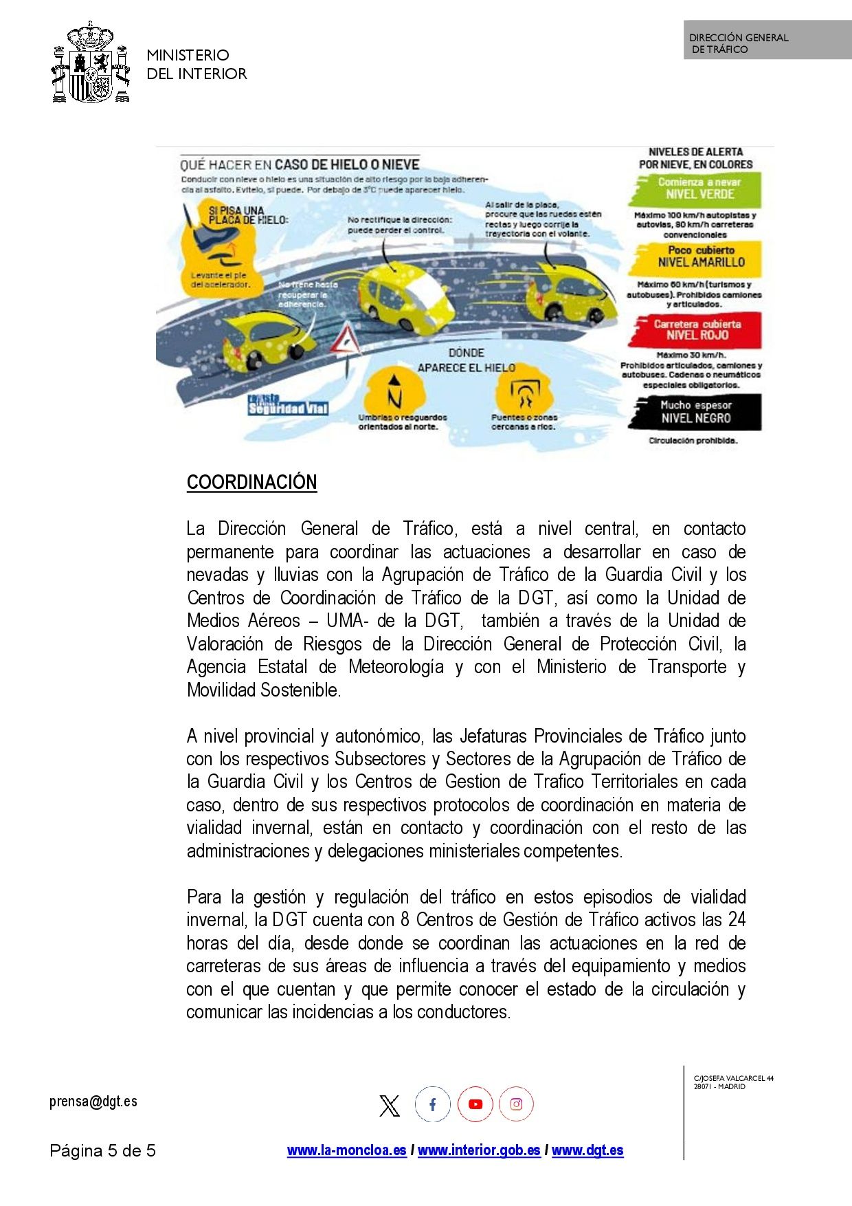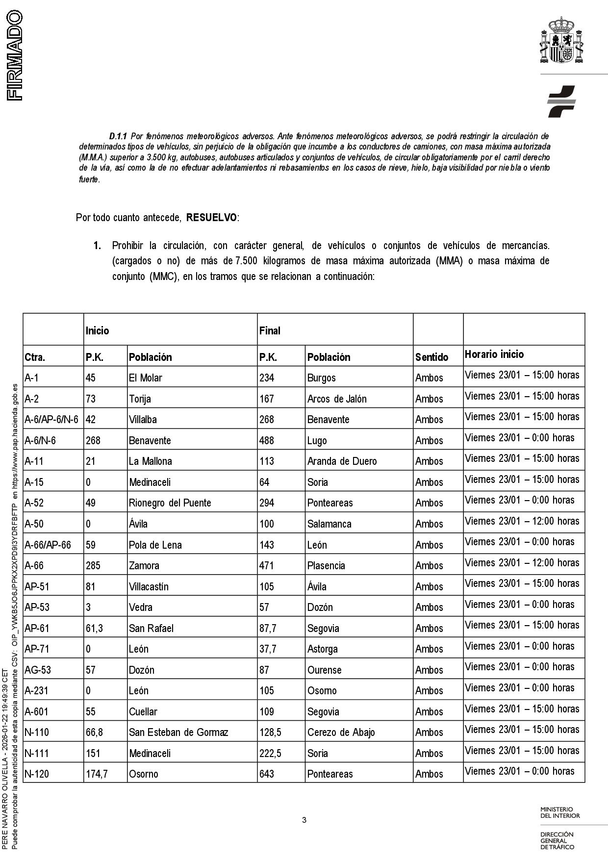 Se adjunta resolución sobre la restricción de vehículos pesados por nevadas como consecuencia de la borrasca Ingrid así como nota de prensa al respecto emitida por la Dirección General de Tráfico.