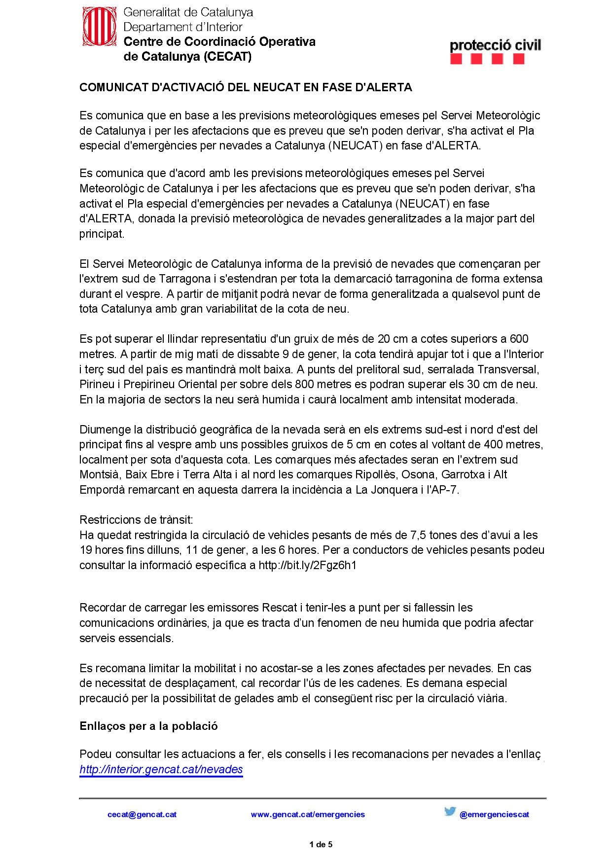 CATALUÑA. ACTUALIZACIÓN ALERTA VIAL POR NEVADAS