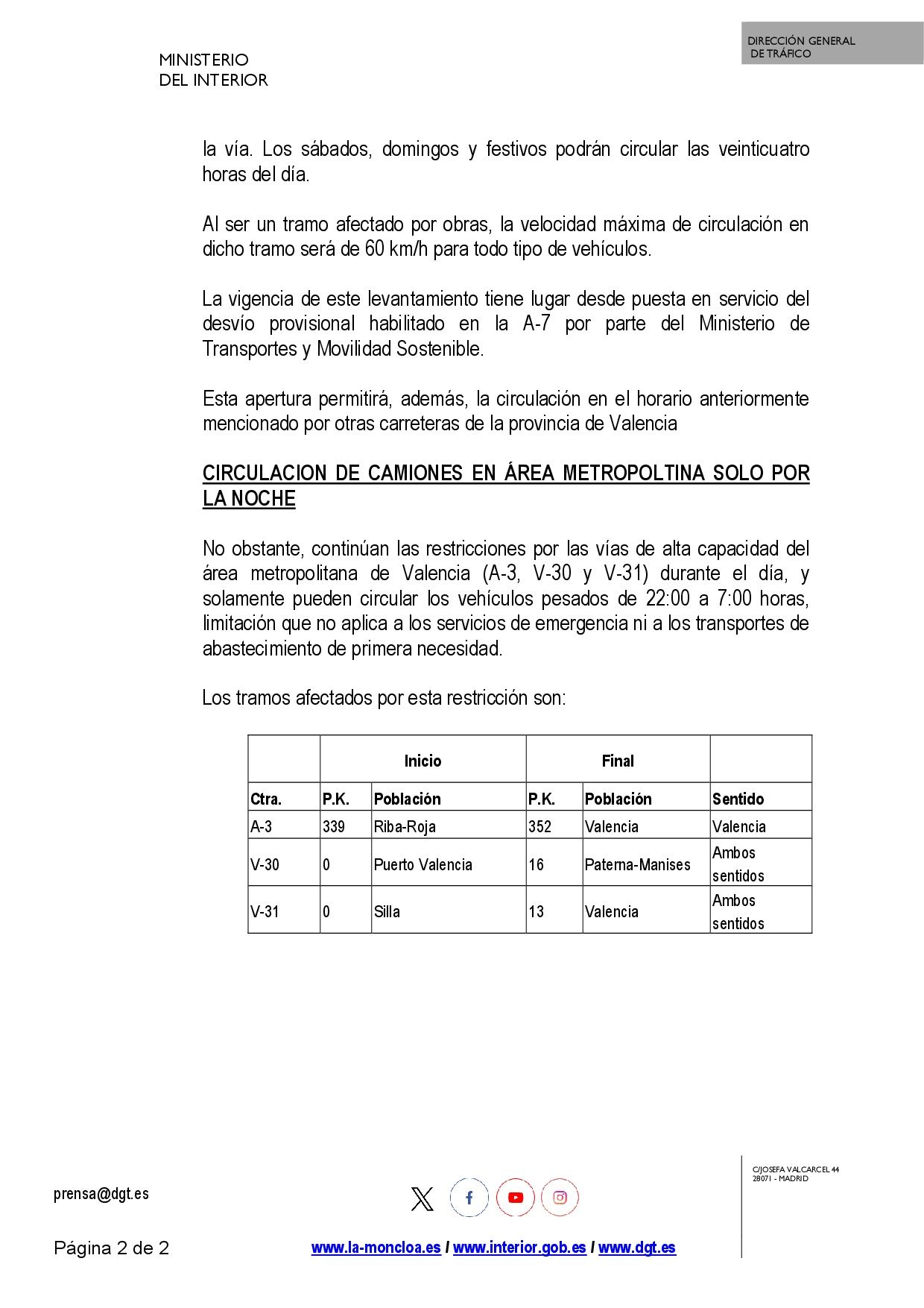 Continúan las restricciones por las vías de alta capacidad en el área metropolitana de Valencia (A3, V30 y V31), en las que solo podrán circular los vehículos pesados de 22h a 7h e los siguientes tramos: