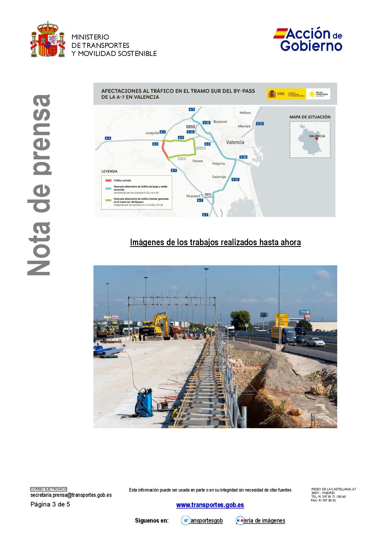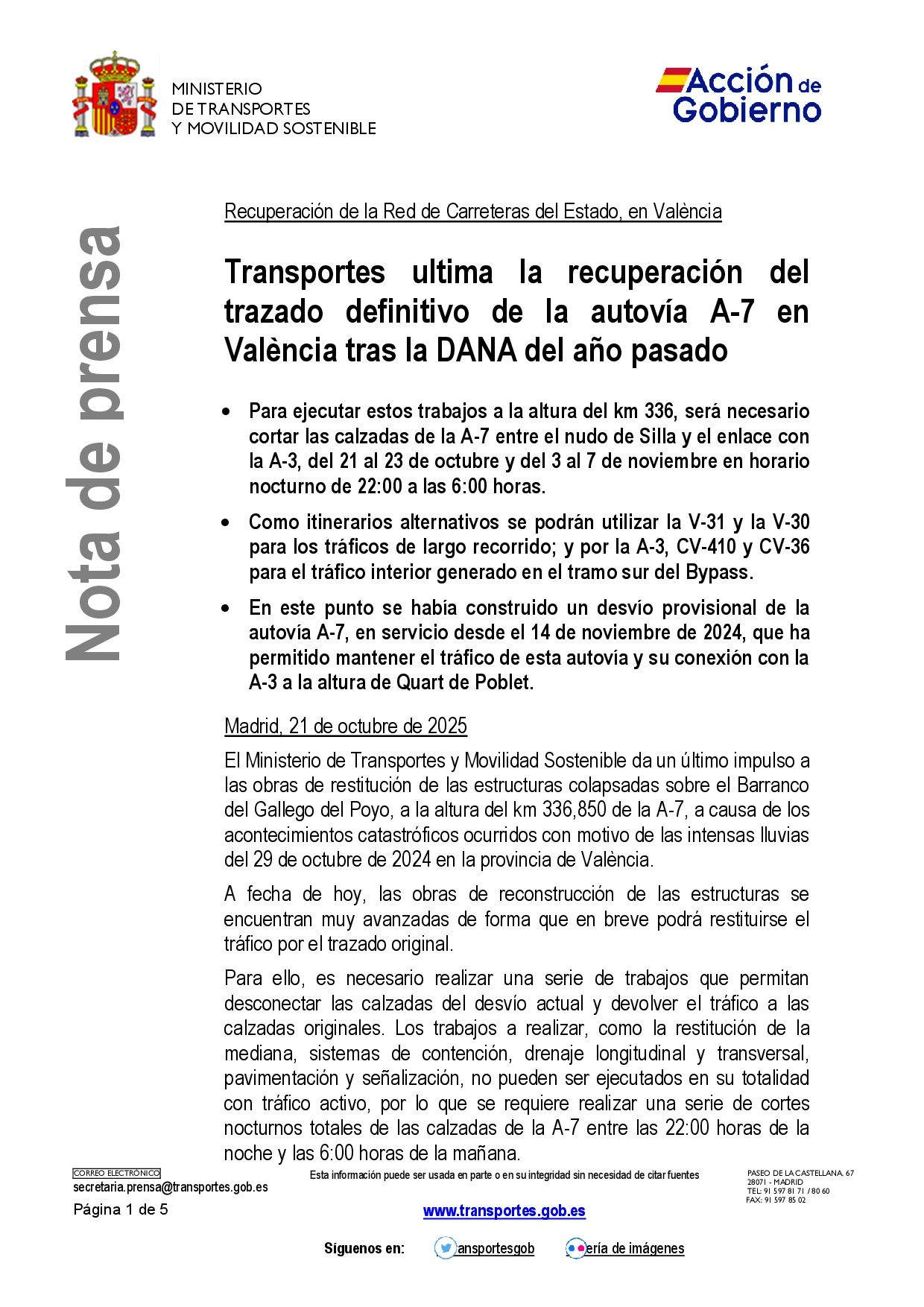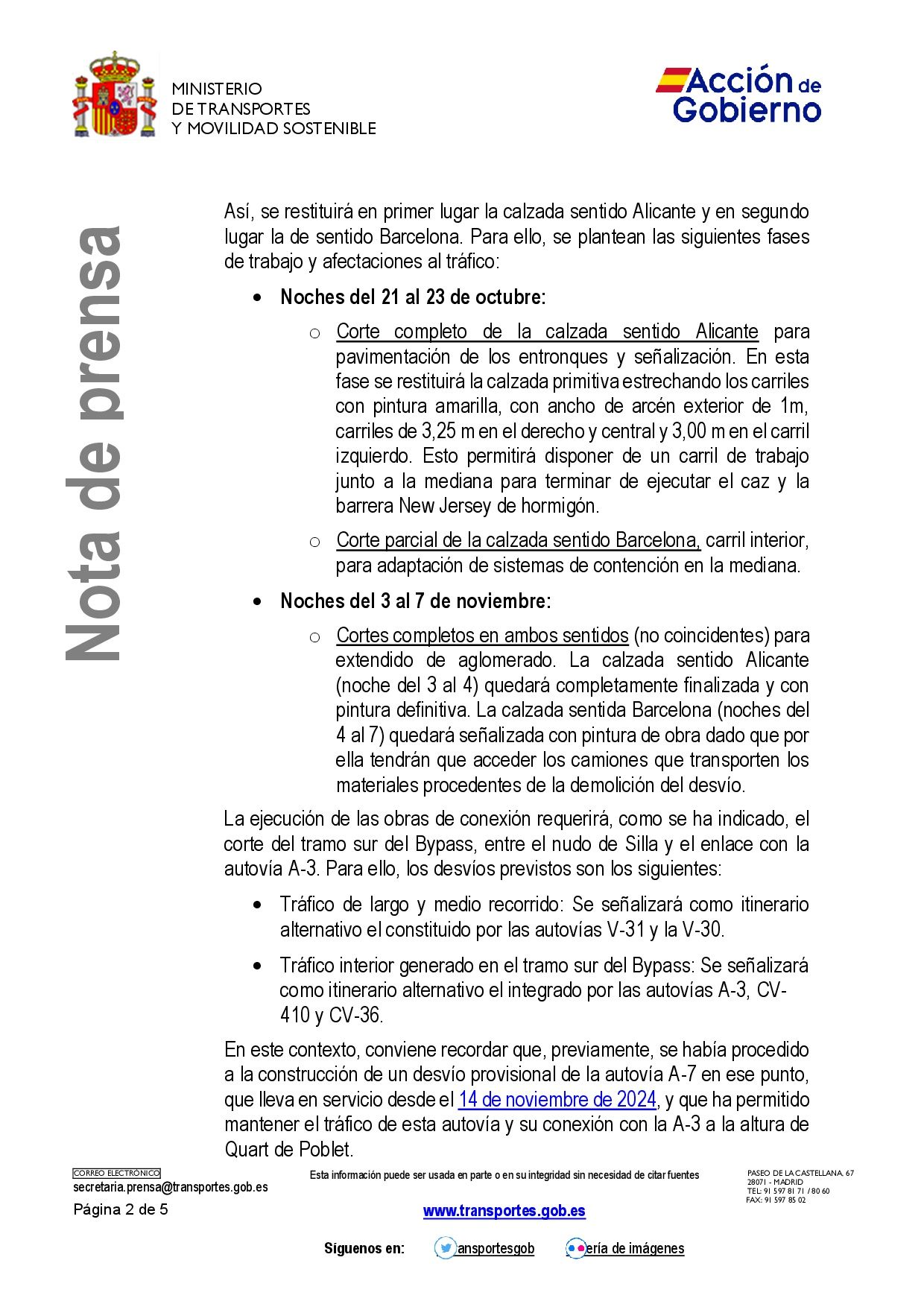 Desde el Ministerio de Transporte alertan de que será necesario cortar las calzadas de la carretera A-7 entre el nudo de Silla y el enlace con la carretera A-3, del 21 al 23 de octubre y del 3 al 7 de noviembre en horario nocturno de 22:00h a 6:00h.