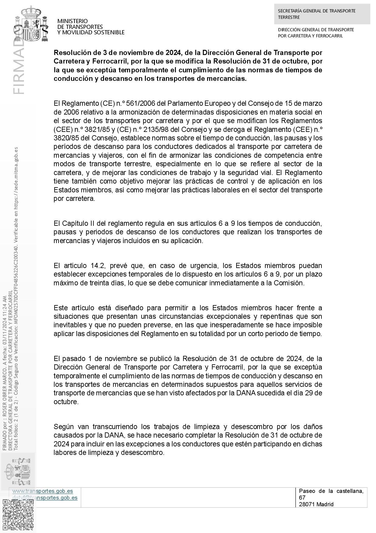 Así mismo, adjuntamos la Resolución de 3 de noviembre de 2024, de la Dirección General de Transporte por Carretera y Ferrocarril, por la que se modifica la Resolución de 31 de octubre, por la que se exceptúa temporalmente el cumplimiento de las normas de tiempos de conducción y descanso en los transportes de mercancías.