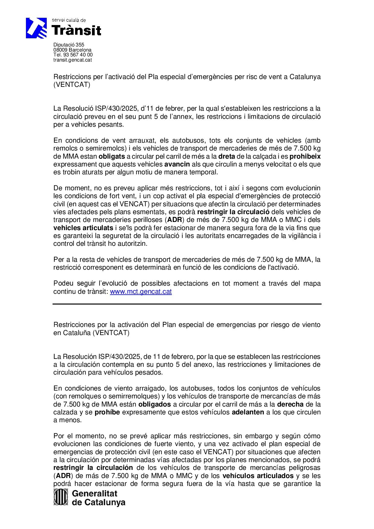 - NOTA relativa a las Restricciones por la activación del Plan especial de emergencias por riesgo de viento en Cataluña (VENTCAT), del Servei Català de Trànsit.